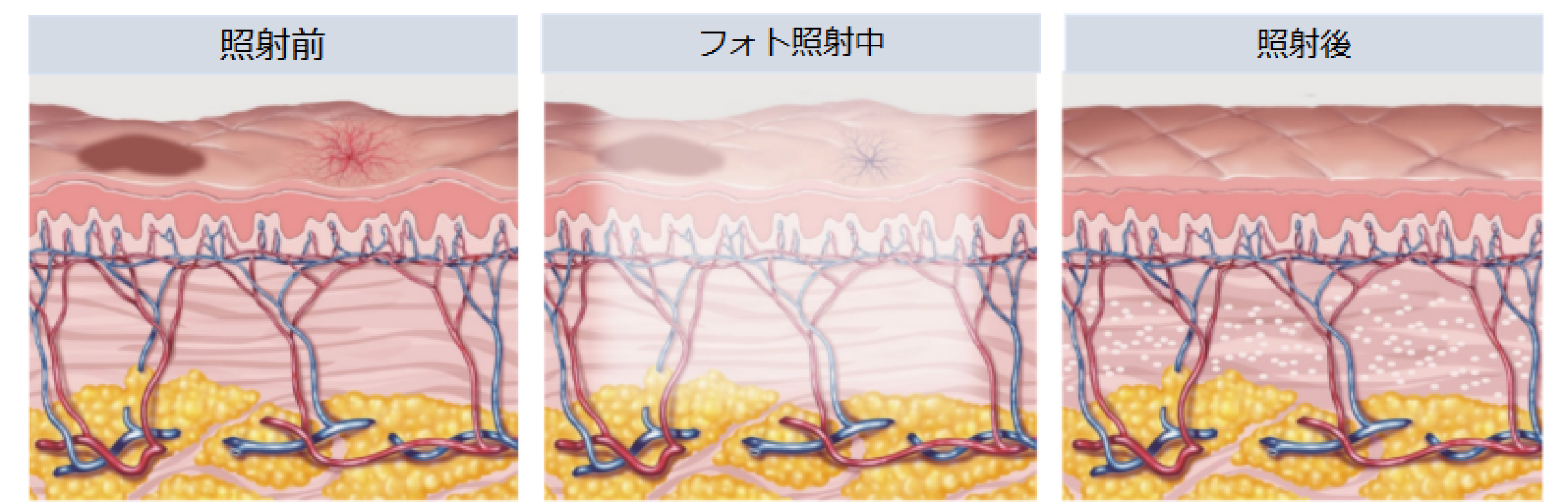 フォト治療機から放出される特殊な光が、毛細血管のヘモグロビンに反応して熱が発生します。その熱が拡張した毛細血管の内皮細胞にダメージを与えることで、毛細血管を消退させます。